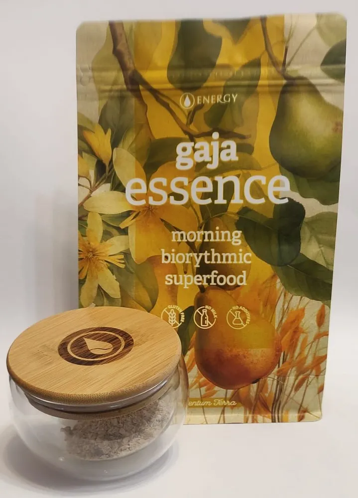 Gaja essence je čistě přírodní, harmonizační a biorytmická kaše sestavená podle principů tradiční čínské medicíny (TČM). Respektuje nutriční potřeby a klíčové biorytmy organismu – ve správnou chvíli dodává našemu tělu co nejšetrněji připravené a vzájemně sladěné esenciální ingredience. Všechny suroviny jsou pečlivě vybrané s důrazem na kvalitu i způsob zpracování, kdy byla zachována jejich ryzí čistota a živá podstata. Kaše je naprosto bez chemie, aditiv a konzervantů. Neobsahuje lepek, živočišné mléko ani rafinovaný cukr.
